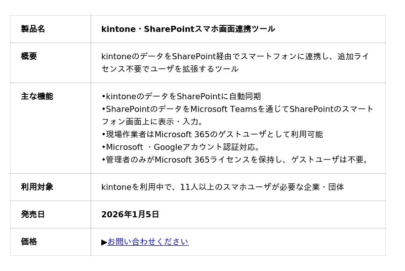 株式会社メディアフュージョン(大阪市)は、kintoneとMicrosoft 365 SharePointを連携させた「kintone・SharePointスマホ画面連携ツール」を2026年1月5日より販売開始します。本ツールは、スマホ利用時のライセンスコストを抑え、複数クラウドの強みを融合したハイブリッドソリューションを実現します。