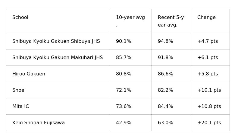 Based on five-year averages, acceptance shares exceeded the ten-year average at schools including Shibuya Kyoiku Gakuen Shibuya, Shibuya Kyoiku Gakuen Makuhari, Hiroo Gakuen, and Keio Shonan Fujisawa Junior High School.
