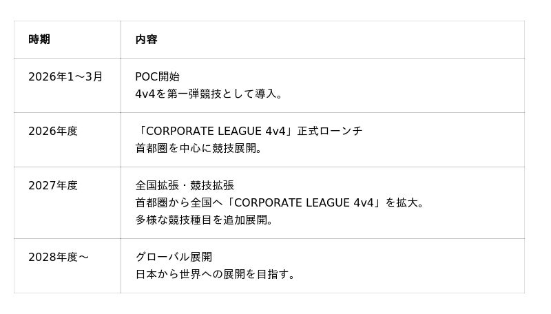 今後は、より多様な人が参加できる機会を広げていくため、4v4に限らず、複数の競技を取り入れた 「CORPORATE LEAGUE」の展開を順次検討していく予定です。