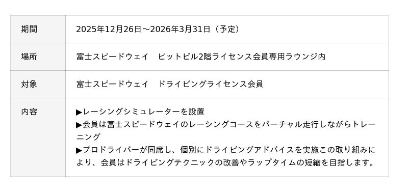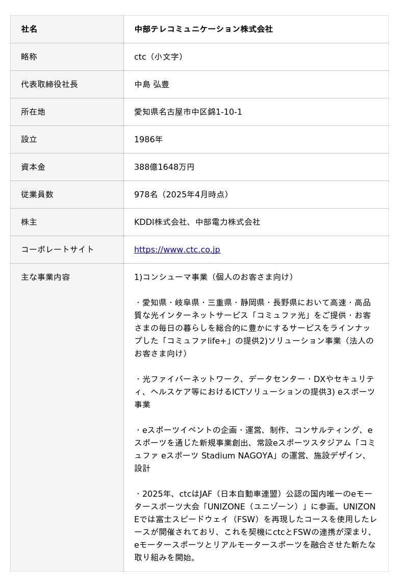 eスポーツ事業に取り組む通信事業者の中部テレコミュニケーション株式会社(本社:愛知県名古屋市、代表取締役社長:中島弘豊、略称:ctc)と、日本を代表する国際サーキットのひとつである富士スピードウェイ株式会社(本社:静岡県駿東郡小山町、代表取締役 社長執行役員:酒井良)は、「レーシングシミュレーター+ドライビングアドバイス」の実証実験を、2025年12月26日から開始いたします。
