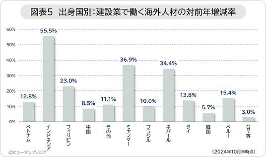出身国別にみると、約7万人とベトナムが最多で、3.7万人のインドネシアが続いています。特にインドネシアは前年比で55.5%の大幅増となり、ベトナムとインドネシアの2カ国で、建設業で働く海外人材の約6割を占めています。そして2.0万人のフィリピン、1.4万人の中国が続き、まだ人数は少ないものの、ミャンマーが前年から36.9%増、またネパールも前年から34.4%増となり、徐々に存在感を高めています(図表4、図表5)。