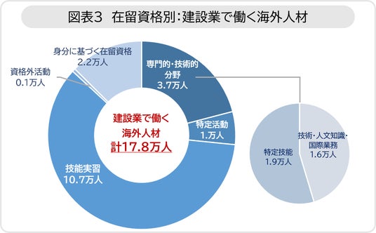在留資格別では、約6割にあたる10.7万人が「技能実習」で、約2割となる3.7万人が、「専門的・技術的分野」の在留資格で就業しています。特に「専門的・技術的分野」に含まれる「特定技能」(建設技能工が含まれる)が1.9万人となり、前年から57.9%増と大幅に伸びています(図表3)。建設業での特定技能の受け入れ上限は「2024年からの5年間で8万人」であり、建設技能工の不足を背景に、特定技能での就業者は今後数年間でさらに増えると予測されます。
