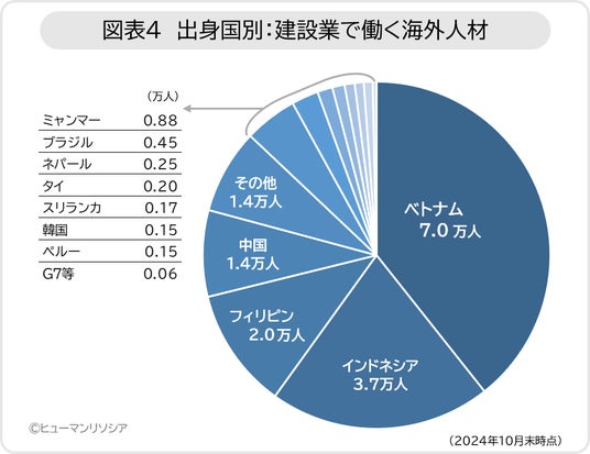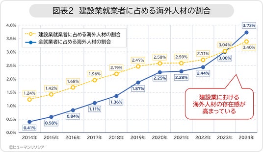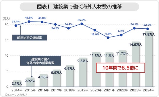 総合人材サービス会社で建設業向けの人材紹介・人材派遣・海外エンジニア派遣サービスを展開するヒューマンリソシア株式会社(本社:東京都新宿区、代表取締役:高橋 哲雄、以下「当社」)は、建設業における人材動向について、統計データベースなどを基に独自集計し、レポートとして発表しています。このたび最新データから日本の建設業で働く海外人材の動向について独自に集計し、レポートとして発表します。