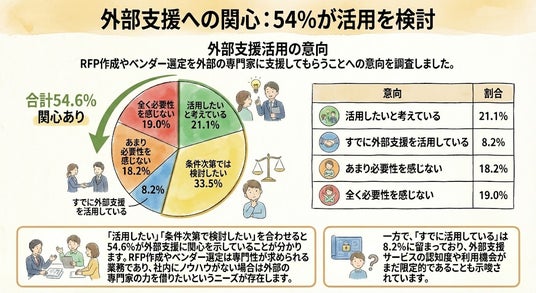 本調査の結果、約6割の企業がRFP作成に課題を抱えており、54%以上がベンダー選定における外部支援の活用に関心を示していることが明らかになりました。