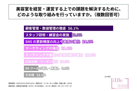 続いて、美容室を経営・運営する上での課題を解決するために何らかの取り組みを行っていると回答された方に「美容室を経営・運営する上での課題を解決するために、どのような取り組みを行っているか」を尋ねる設問への回答では、1位が「顧客管理・数値管理の徹底」で56.1%、2位が「スタッフ研修・練習会の実施」で30.3%、3位が「SNSの更新頻度の向上や発信の強化」で24.2%という結果になりました。この結果から、美容室を経営・運営する上での課題を解決するための取り組みとして最も行われていることは「顧客管理・数値管理の徹底」であることが判明しました。