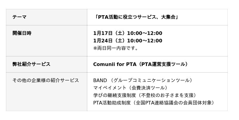 【告知】オンラインイベント「PTA活動に役立つサービス、大集合」(1/17,1/24開催)で「Comunii for PTA」を紹介します!