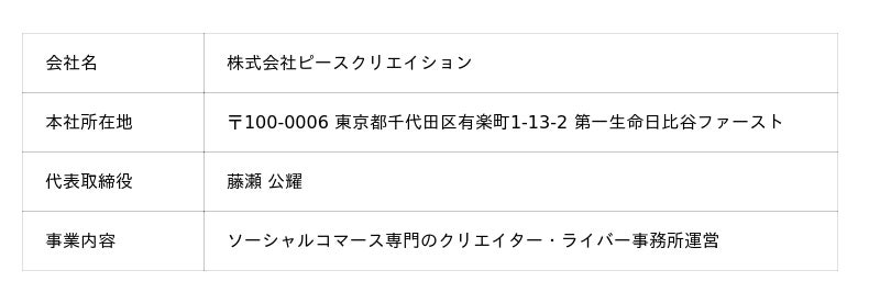 ピースクリエイションは、親会社の株式会社いつも(本社:東京都千代田区、代表取締役社長:坂本守)が14,000件以上のEC・D2Cの総合支援で培ったノウハウと、グループ会社の株式会社ピースユー(本社:東京都千代田区、代表取締役:藤瀬公耀)が提供する日本最大級のライブコマースアプリ「Peace you LIVE」の運営実績や、ライバーとのネットワークを活かした、ソーシャルコマース専門のクリエイター・ライバー事務所です。