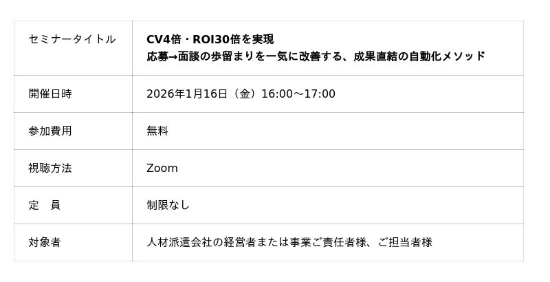 人材ビジネス向けマッチングシステムを提供するポーターズ株式会社(東京証券取引所グロース.証券コード5126、東京都港区、代表 西森 康二)は、オープン株式会社(以下、オープン)と共同で「CV4倍・ROI30倍を実現。 応募→面談の歩留まりを一気に改善する、成果直結の自動化メソッド」と題した無料セミナーを2026年1月16日(金)16:00~オンラインで開催いたします。