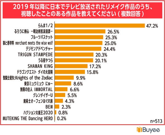 令和元年にあたる2019年以降に日本でテレビ放送されたリメイクアニメのうち、海外アニメファンに最も視聴された作品は「らんま1/2」で47.2%となりました。2位以下の作品も6作品で20%を超えており、リメイク作品の人気の高さもわかる結果となりました。