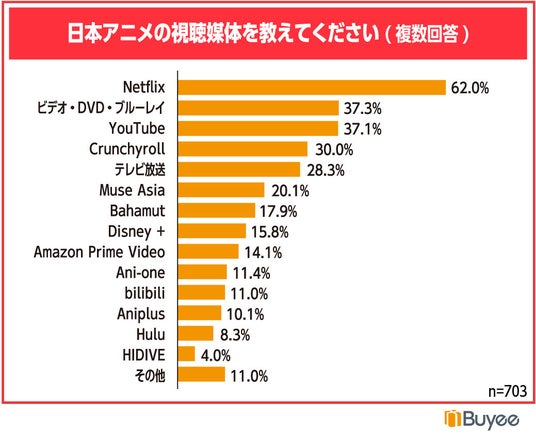 ・日本アニメの視聴媒体は「Netflix」が62.0%と大差で1位、2位には「ビデオ・DVD・ブルーレイ」37.3%がランクインし、オンラインと記録媒体の両面でアニメを楽しんでいることがわかる結果に