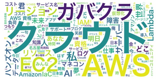 『#トレノケートAWS川柳大賞』で最も多く使われたキーワードは、「クラウド」でした。次いで「AWS」「ガバクラ」「EC2」「リージョン」と続きます。可視化するとこのようになります。