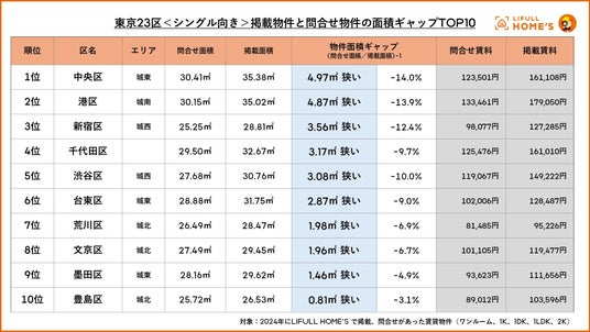 <シングル向き>掲載物件と問合せ物件の面積ギャップ1位は中央区