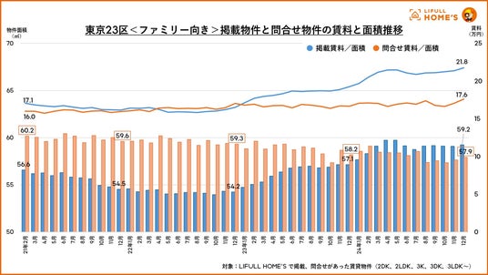 参考:東京23区全体<ファミリー向き・シングル向き>掲載物件と問合せ物件の賃料と面積推移