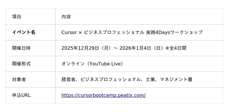 そのリリースを記念して、年末年始の学びなおしの機会にあわせ、完全無料の「Cursor × ビジネスプロフェッショナル 実践4Daysワークショップ」を開催いたします。