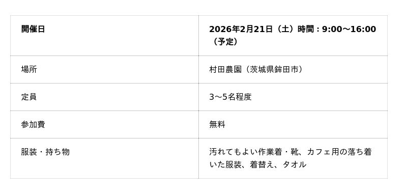 地域の活動に興味のある層が気軽に地域や農業に触れる“最初の接点”をつくり、地域と継続的に関わる関係人口の創出につなげることを目的に、体験型プログラムを企画しており、本企画はその第七弾にあたります。