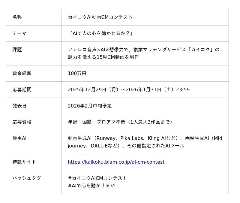 株式会社BLAM(本社:東京都品川区、代表取締役社長 兼 CEO:杉生 遊)は、舞台アーティスト / タレントの芋洗坂係長の音声とAI技術を活用した15秒CM動画コンテスト「カイコクAI動画CMコンテスト」を2025年12月29日(月)より開催します。AIディレクターやAIクリエイターなど新興職業のクリエイターが、自身の創意工夫とスキルを評価される場として、賞金総額100万円を用意しています。また、最優秀賞作品はテレビ広告またはタクシー広告での放映を予定しています。(※広告媒体に関しては現在調整中)