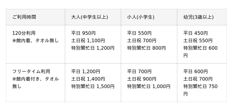 レンタルアイテム:タオルセット330円、館内着330円、レンタル水着550円