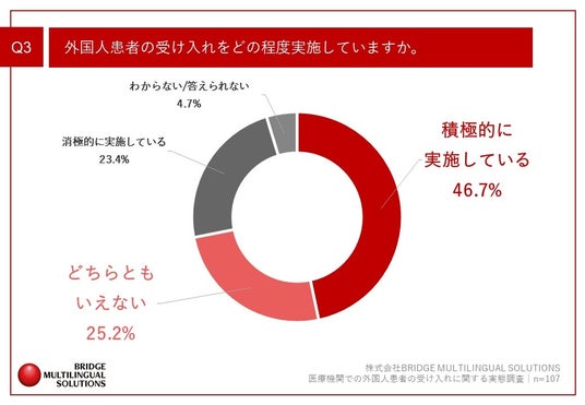 「Q3.外国人患者の受け入れをどの程度実施していますか。」(n=107)と質問したところ、「積極的に実施している」が46.7%、「どちらともいえない」が25.2%、「消極的に実施している」が23.4%という回答となりました。