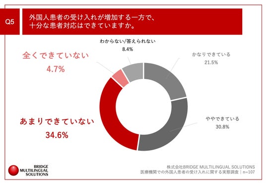 「Q5.外国人患者の受け入れが増加する一方、十分な患者対応はできていますか。」(n=107)と質問したところ、「あまりできていない」が34.6%、「全くできていない」が4.7%という回答となりました。