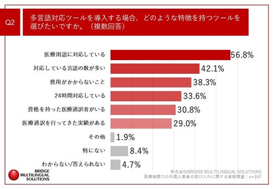 「Q2.多言語対応ツールを導入する場合、どのような特徴を持つツールを選びたいですか。(複数回答)」(n=107)と質問したところ、「医療用語に対応している」が56.8%、「対応している言語の数が多い」が42.1%、「費用がかからないこと」が38.3%という回答となりました。