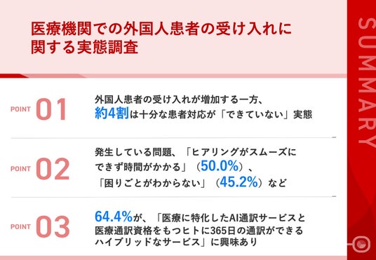 まず、外国人患者に対する言語対応では、「簡単な日本語を使う」が64.5%で最も多く、多言語対応ツールを導入する場合に求めることについて、約6割が「医療用語への対応」と回答しました。一方で、外国人患者の受け入れに「消極的」な医療機関は23.4%に上り、その理由として、「言語の壁があるから」(52.0%)や「医療保険に関する問題があるから」(40.0%)が挙げられています。また、外国人患者の受け入れが増加する一方で、約4割が、十分な患者対応が「できていない」と感じており、それにより生じている問題では、「ヒアリングがスムーズにできず時間がかかる」(50.0%)、「困りごとがわからない」(45.2%)などが上位になりました。さらに、外国人患者の受け入れにおいて、「問診票の記載をお願いするとき」(52.3%)、「初診申込書など初回案内の対応をするとき」(41.1%)に悩みを感じるという声が多く、64.4%が、「医療安全のために医療に特化したAI通訳サービスと医療通訳の資格をもつヒトに24時間365日の通訳ができるハイブリッドなサービス」に興味を示しています。