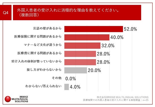 Q3で「消極的に実施している」と回答した方に、「Q4.外国人患者の受け入れに消極的な理由を教えてください。(複数回答)」(n=25)と質問したところ、「言語の壁があるから」が52.0%、「医療保険に関する問題があるから」が40.0%、「マナーなど文化が違うから」が32.0%という回答となりました。