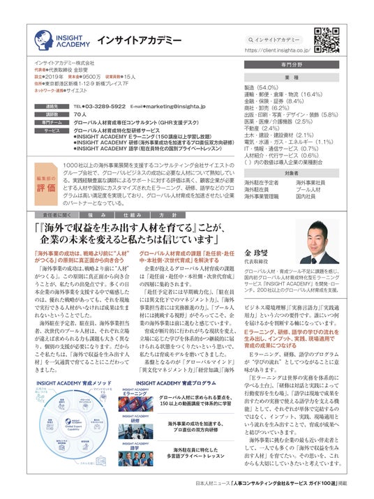 人事専門誌「日本人材ニュース」を発行する株式会社日本人材ニュース社(東京都千代田区、代表取締役:吉越利成)は、企業の人材育成・組織開発を支援する優れた会社とサービスを紹介する「人事コンサルティング会社&サービスガイド100選」に、インサイトアカデミー(東京都港区、金珍燮代表取締役)が参画したことをお知らせいたします。