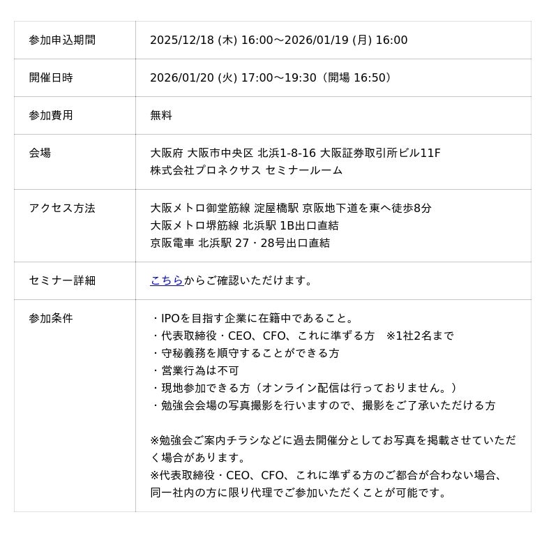 公認会計士人材の知見・経験を活用した経営管理支援サービスを展開するブリッジコンサルティンググループ株式会社(所在地:東京都港区、代表者:宮崎良一)は、2026年1月20日(水)に「第40回 IPO勉強会@大阪 『東京証券取引所の社員が語るIPOの現状」を開催します。