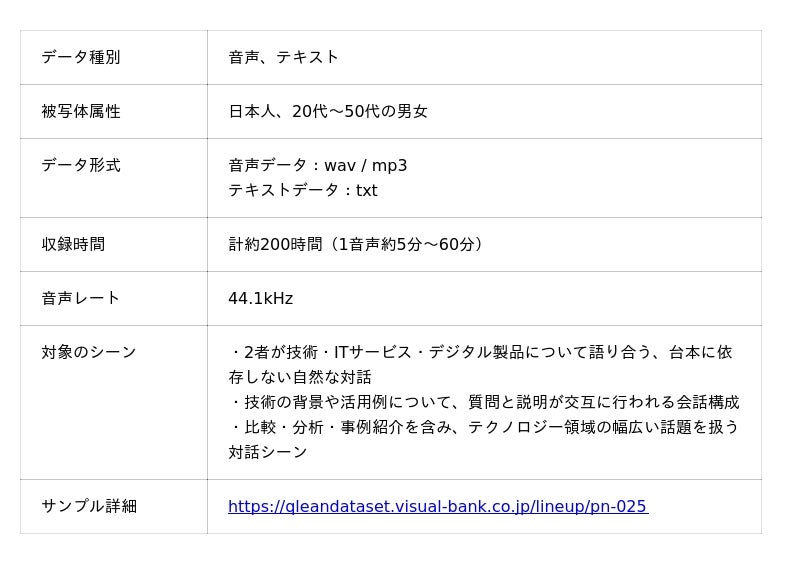 Visual Bank Inc. (Minato-ku, Tokyo; CEO: Saneyuki Nagai; hereinafter “Visual Bank”) has launched a new dataset titled “Japanese Two-Speaker Technology-Themed Speech Transcripts” as part of Qlean Dataset, its AI training data solution operated through its subsidiary, Amana Images Inc.