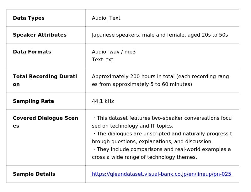 This dataset is a new addition to AI Data Recipe, Qlean Dataset’s machine learning dataset lineup. It consists of Japanese two-speaker conversational speech centered on technology and IT topics, along with corresponding speech transcripts.