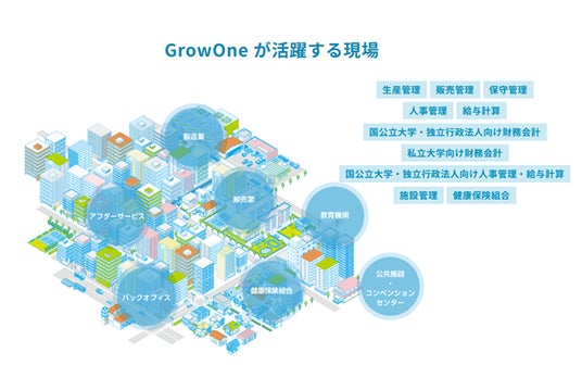 GrowOneシリーズは、一般企業はもちろん、大学、自治体、健康保険組合の業務にも対応しています。
