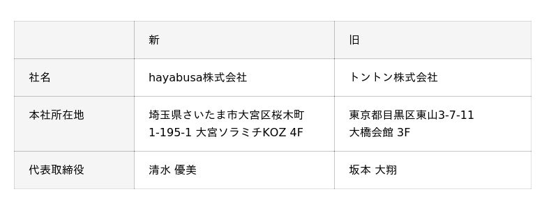 株式会社miraism(東京本社:東京都渋谷区、代表取締役:川野 洋平、以下「当社」)の子会社であるトントン株式会社(本社:東京都目黒区、代表取締役:坂本 大翔、以下「トントン」)は、2026年1月1日をもって社名を「hayabusa株式会社」に変更し、本社を移転いたしました。併せ、代表取締役の交代をいたしましたのでお知らせいたします。