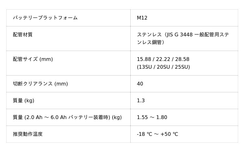 ▶外径15.88 mmのステンレス鋼パイプを最大180カット (2.0Ahバッテリー使用時)