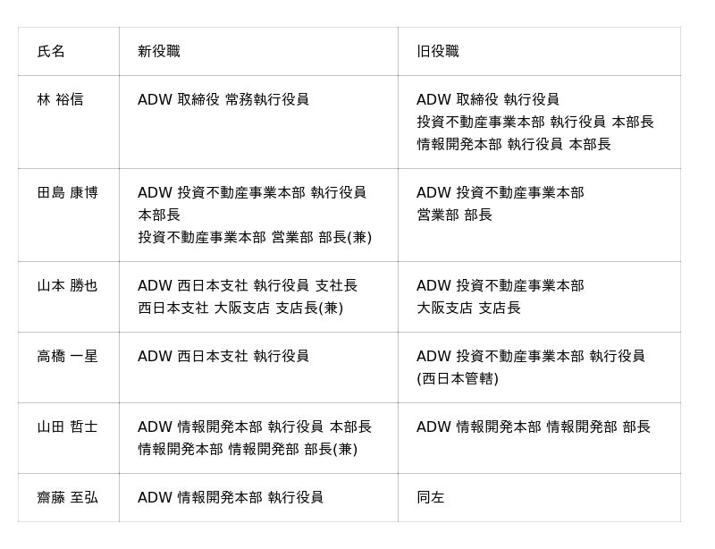 そうした方針のもと、当社グループの主要子会社である株式会社エー・ディー・ワークス(以下、「ADW」)は、2026年1月1日付で国内一棟収益不動産販売事業における取引先とのさらなるリレーションを強化し、仕入れ・物件価値向上・販売活動をよりいっそう推進するため、組織再編及び人事体制の変更を行いましたので、以下のとおりお知らせいたします。