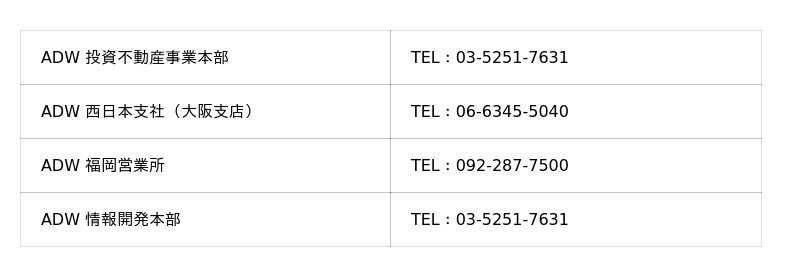 株式会社ADワークスグループ株式会社ADワークスグループとその子会社(事業会社)からなるADWGグループは、東京に本社を持ち、大阪、福岡、ロサンゼルスにも拠点を置く、不動産を中心とした投資ソリューションカンパニーです。