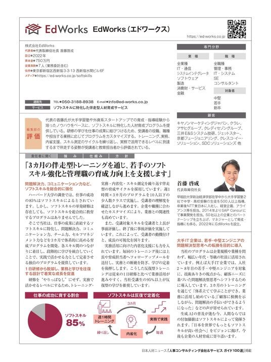 人事専門誌「日本人材ニュース」を発行する株式会社日本人材ニュース社(東京都千代田区、代表取締役:吉越利成)は、企業の人材育成・組織開発を支援する優れた会社とサービスを紹介する「人事コンサルティング会社&サービスガイド100選」に、EdWorks(エドワークス)(東京都新宿区、首藤啓成代表取締役社長)が参画したことをお知らせいたします。
