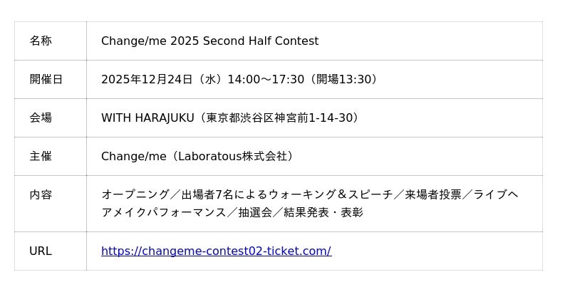 Laboratous株式会社(本社:長野県長野市、代表取締役:北原孝彦)が運営するインナーケアブランド「Change/me」は、2025年12月24日(水)、WITH HARAJUKU(東京都渋谷区)にて、コンテストイベント「Change/me 2025 Second Half Contest」を開催いたしました。