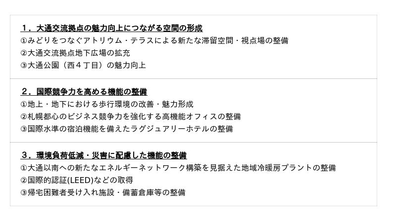 本事業は、当社の中期経営計画「WAY 2040 Stage 1」における成長戦略の一つである「再開発事業の拡大~人々を惹きつける場づくりの全国展開~」を推進するものです。札幌都心の駅前通と大通の交差部に位置し、商業・業務・交流機能の充実、国際水準の宿泊機能としてのラグジュアリーホテル導入、重層的な歩行者空間の整備、大通以南初のエネルギーセンターの整備や環境配慮、防災機能の強化等を行うことにより、札幌都心の価値向上に寄与し、持続可能で魅力ある札幌都心をけん引する拠点の形成を目指してまいります。