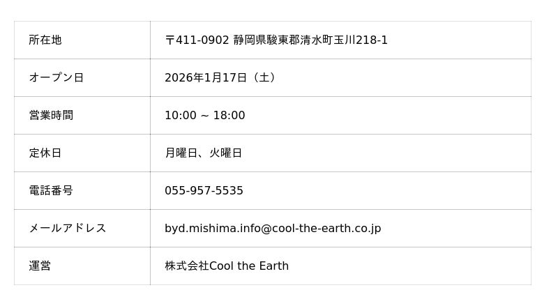 BYDの日本法人であるBYD Auto Japan株式会社(本社:神奈川県横浜市、代表取締役社長:東福寺 厚樹、略称:BAJ)の正規ディーラーである株式会社Cool the Earth(本社:静岡県静岡市、代表取締役:川島 広己)は、2026年1月17日(土)に、静岡県内第3店舗目となるショールームを備えた正規ディーラー「BYD AUTO 三島」をオープンします。