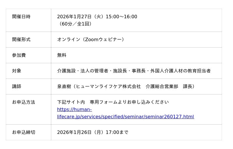 介護事業等を展開するヒューマンライフケア株式会社(本社:東京都新宿区、代表取締役:瀬戸口信也、以下「当社」)は、介護事業所の事務長・施設長向け無料オンラインセミナー「介護現場が迷わない、海外人材「最強の受入れ体制」とは?ー属人化・丸投げを防ぐ法人主導の構築メソッドー」を、1月27日(火)に開催いたします。