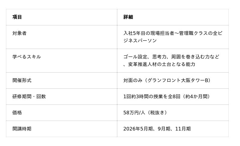 こうした背景を踏まえ、2026年5月より、関西エリアから参加しやすい会場として、グランフロント大阪タワーBで開催し、受講の機会を広げ、関西発の「変革推進人材」育成を支援します。