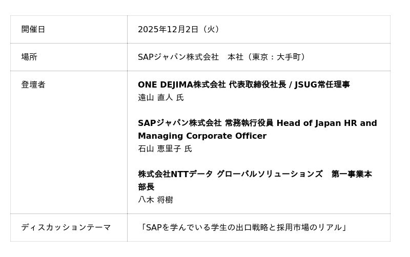 株式会社NTTデータ グローバルソリューションズ(本社:東京都中央区、代表取締役社長:木村 千彫、以下 NTTデータGSL)の幹部が、2025年12月2日(火)~3日(水)にSAPジャパン株式会社本社にて開催された、日本最大級のアカデミックイベント「SAP Academic Community Conference Japan 2025」に登壇しました。本イベントは、SAPエコシステムにおける教育・研究・産業領域をつなぎ、次世代の人財育成とキャリア形成を共に考える場として、大学教員・学生・企業関係者が一堂に会するものです。
