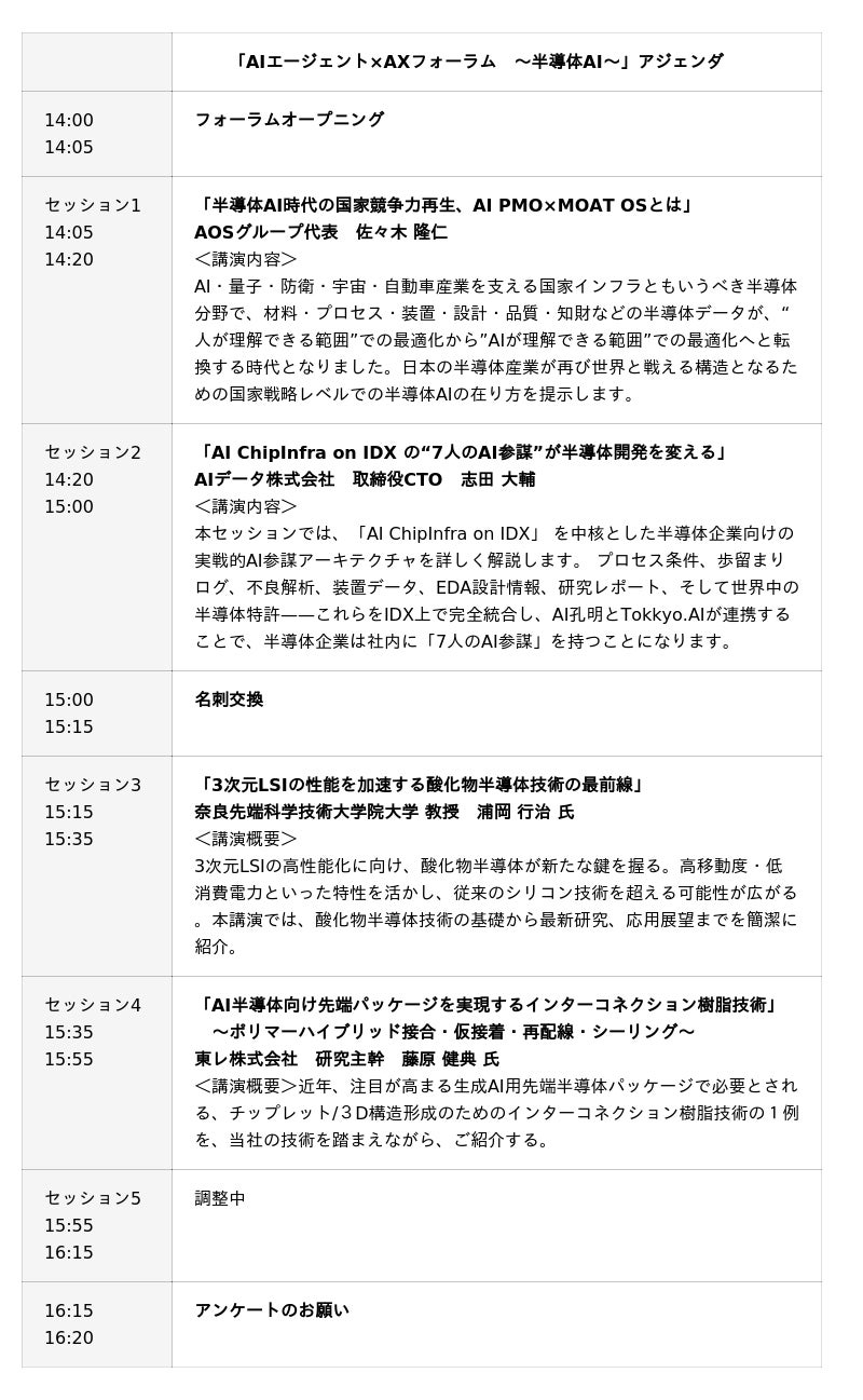 AIは半導体産業の“頭脳”になるか?- 国家競争力を左右する、日本半導体AXの最前線。AIデータ社、「AIエージェント×AXフォーラム Jan. ~半導体AI~」 1/22開催