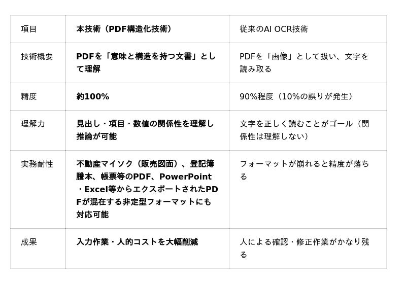 従来のOCRがPDFを「画像(絵)」として読み取っていたのに対し、本技術はPDFを「意味と構造を持つ文書」として認識します。