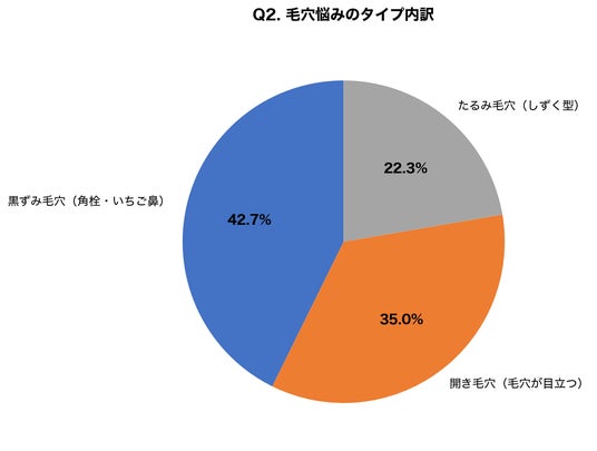 ・毛穴悩みの内訳は「黒ずみ」42.7%、「開き」35.0%、「たるみ」22.3%の順