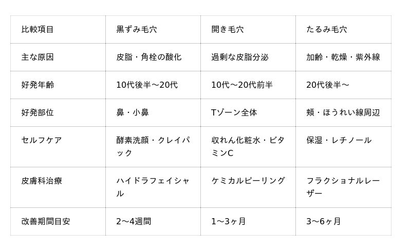 結論から言うと、20歳前後の毛穴悩みは「黒ずみ」「開き」「たるみ」の3タイプに分類され、それぞれ原因と対策が異なります。黒ずみには酵素洗顔やクレイパック、開きには収れん化粧水やビタミンC誘導体、たるみ毛穴には保湿とレチノールが有効です。セルフケアで改善しない場合は、皮膚科でのケミカルピーリングやレーザー治療が選択肢となります。