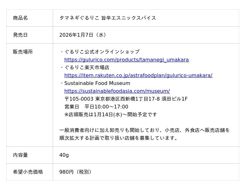 『「もったいない」を「おいしい!」に』をミッションに掲げるフードテックスタートアップのASTRA FOOD PLAN 株式会社(埼玉県富士見市、代表取締役社長:加納 千裕 以下ASTRA FOOD PLAN)は、2026年1月7日(水)に、玉ねぎ端材をアップサイクルした乾燥オニオンフレークを使用した新感覚クラフト調味料「タマネギぐるりこ」シリーズの第4弾となる新フレーバー「旨辛エスニックスパイス」を発売いたします 。
