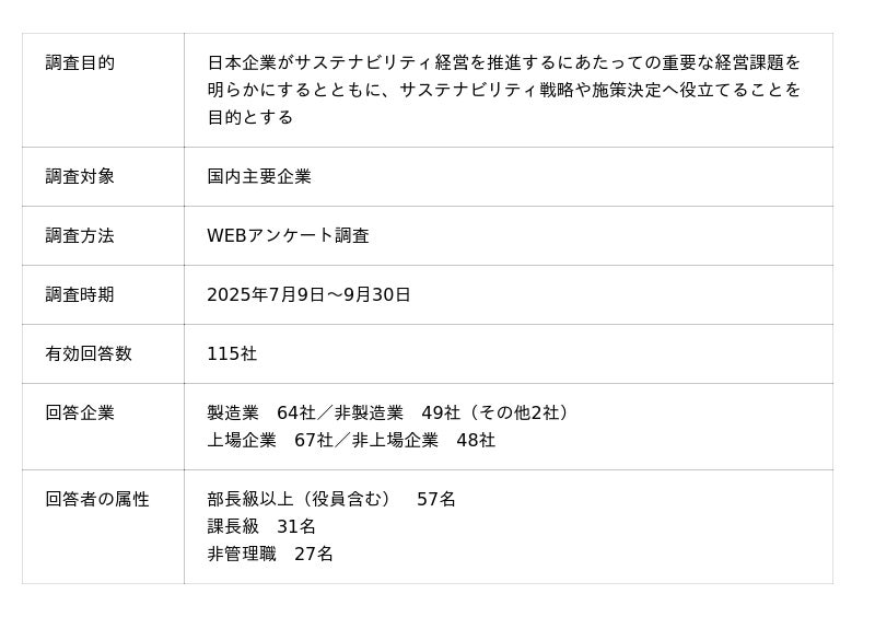今回、サステナビリティ経営のその後の進展状況を把握するために、「第3回サステナビリティ経営課題実態調査」を2025年7月~9月に実施しました。