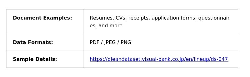 本データセットは、Qlean Datasetが展開する機械学習用データセットラインナップ『AIデータレシピ』の新たなラインナップとして提供するもので、履歴書、職務経歴書、領収書、申込書、アンケートなど、実際の業務プロセスで日常的に扱われる書類を対象としたドキュメントデータで構成されています。