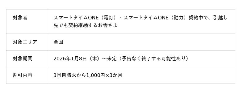 そしてこの度、「引越ししても、できるだけお得に電気を使いたい」というニーズに対応し、「引越し祝い割」を開始しました。Looopでんきをご契約中のお客さまのうち、お引越しの際にLooopでんきを引き続きご契約いただいた方を対象に、引越し後の3回目の請求から3か月間にわたって合計3,000円の割引を実施します。
